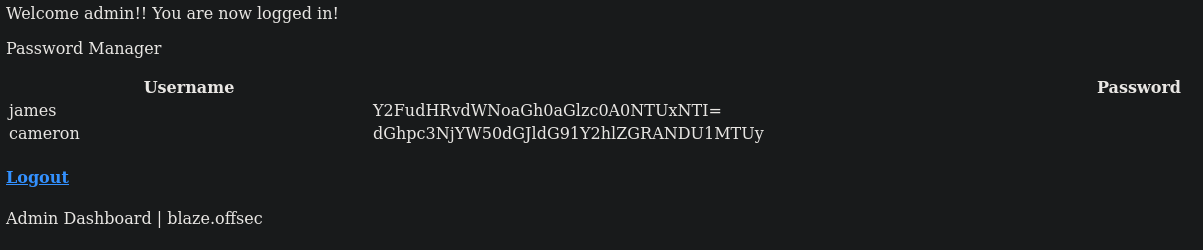 If we replace the injection with: admin' AND 1=1 -- - we’ll get logged in as the admin user and get a couple of credentials.