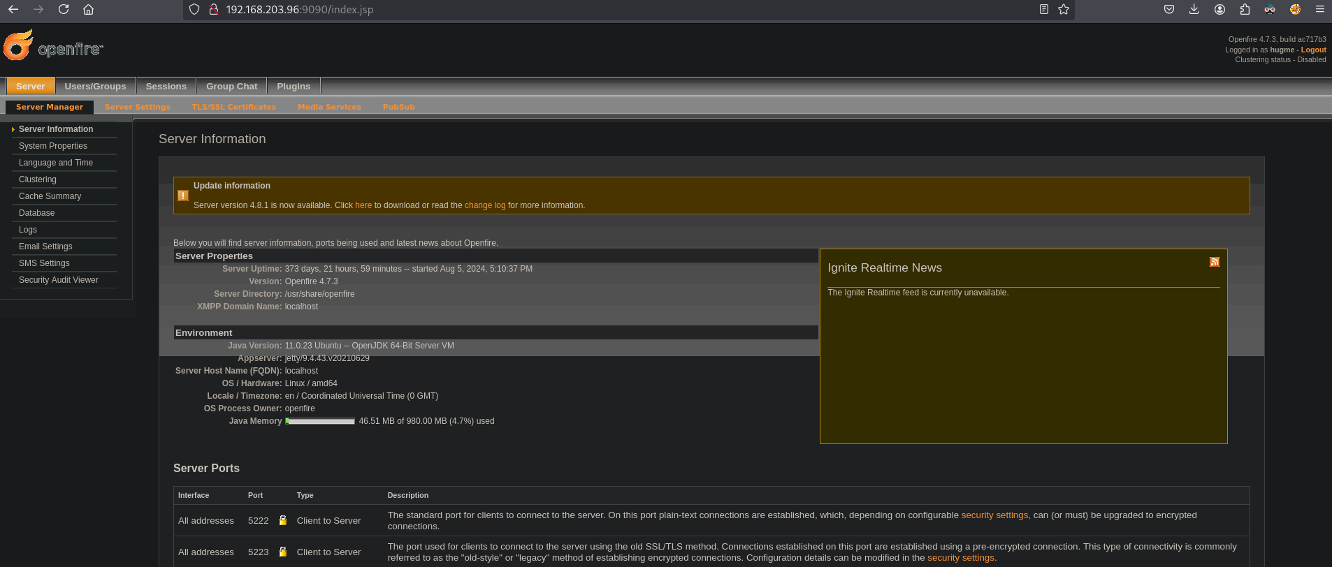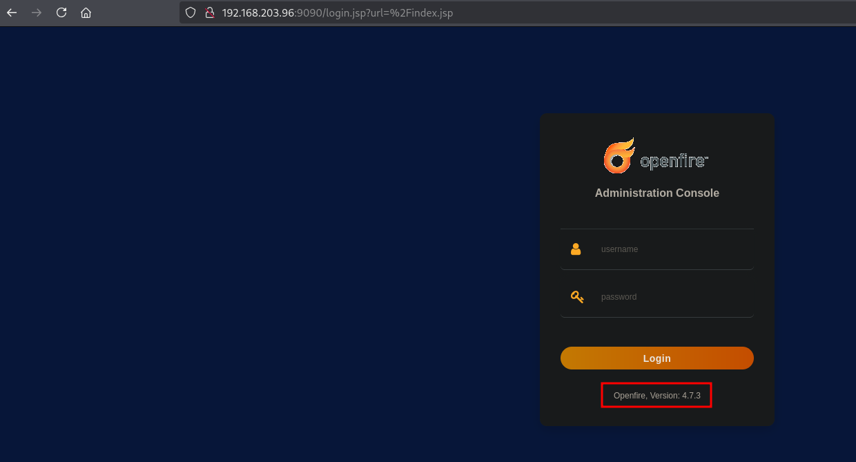 On port 9090 we find a login screen of an Openfire application with version 4.7.3.