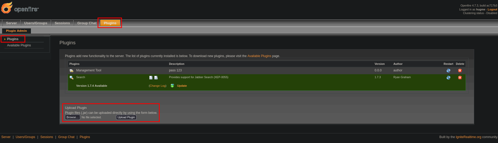 Using the .jar plugin found on https://github.com/miko550/CVE-2023-32315, we can get RCE. Download the openfire-management-tool-plugin.jar locally and upload in the application.