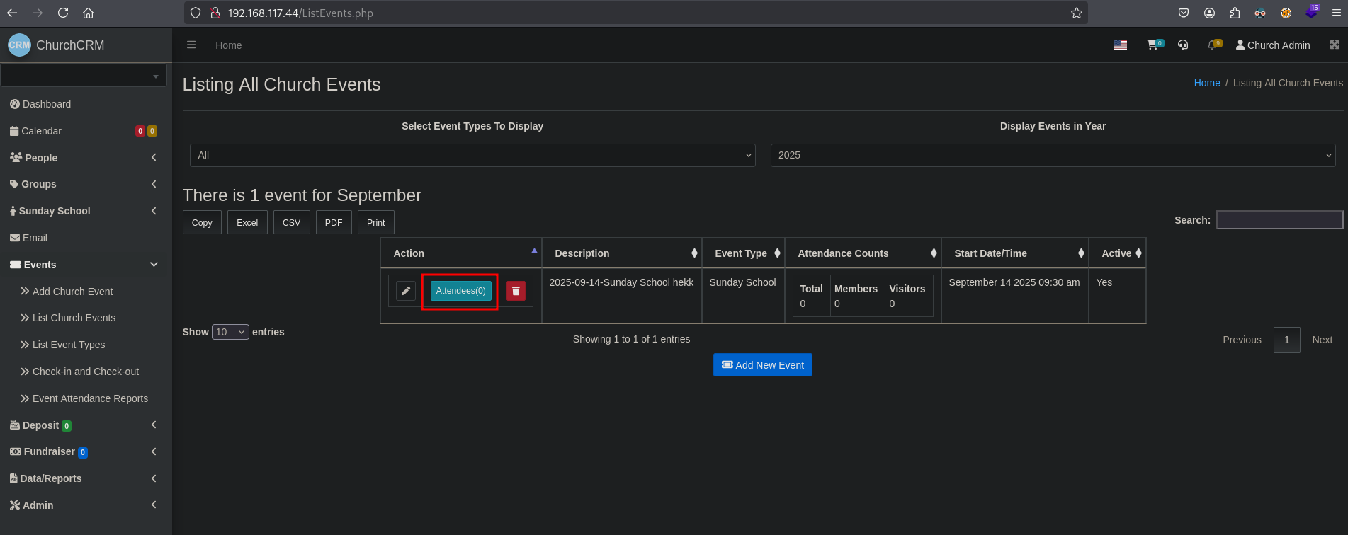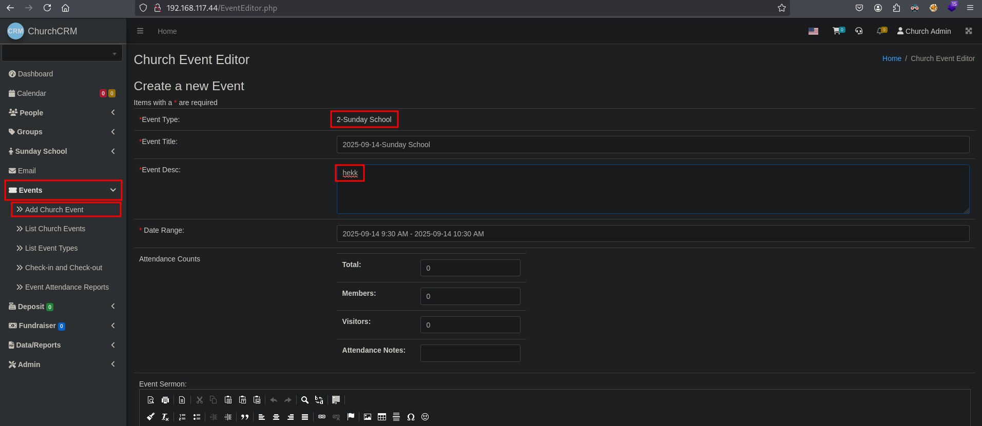 We’re going to follow this exploit (https://grimthereaperteam.medium.com/churchcrm-v4-4-5-sql-injection-vulnerabilities-at-editeventattendees-php-8e2f651f3deb) so we can dump the entire database using sqlmap. Click in the application on Events / Add Church Event, then select Sunday School as Event Type and enter some text in the Event Desc field. Scroll down and click on Save Changes.