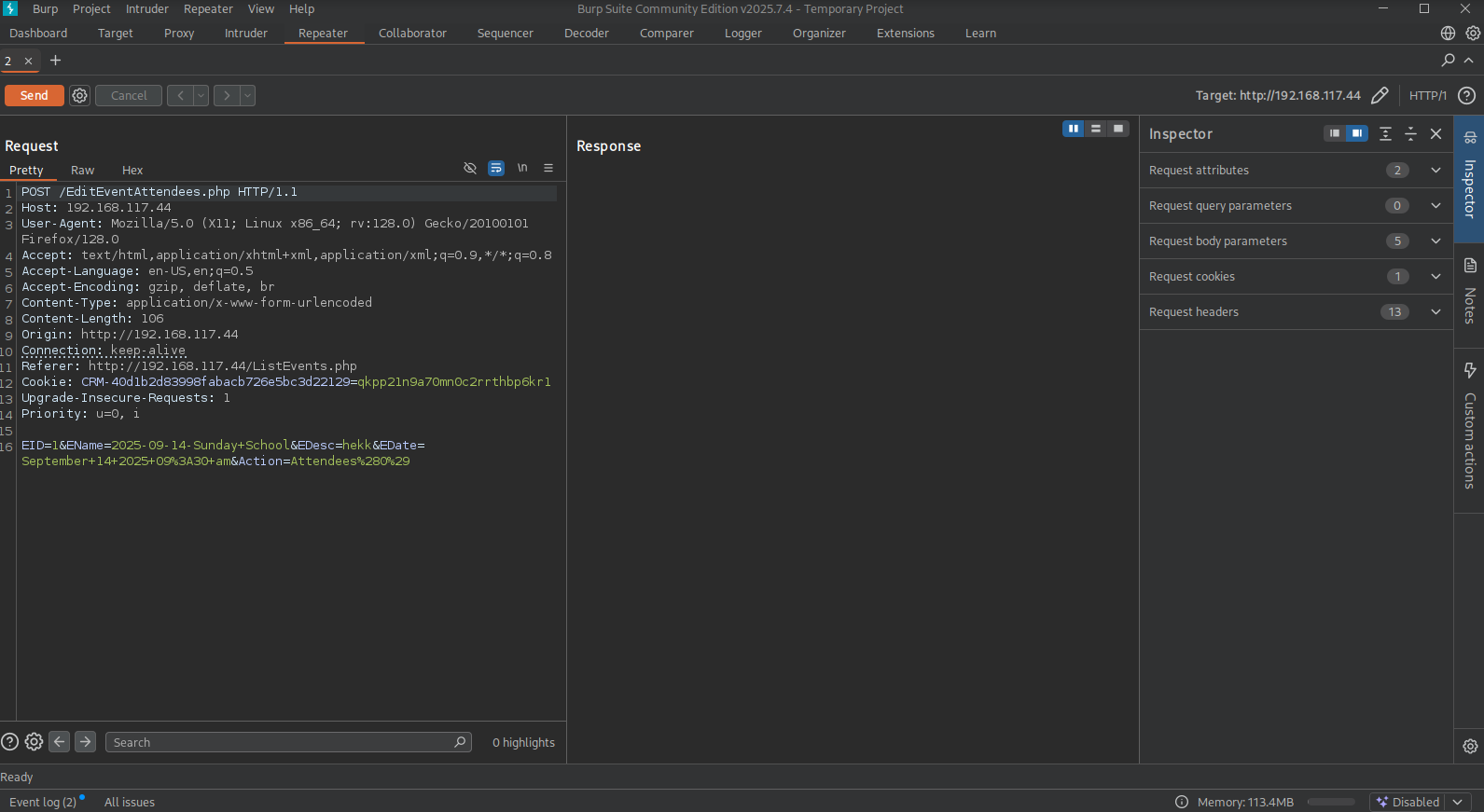 Once saves, start BURP and set it to intercept. Now click on Attendees and in BURP send the request to repeater.