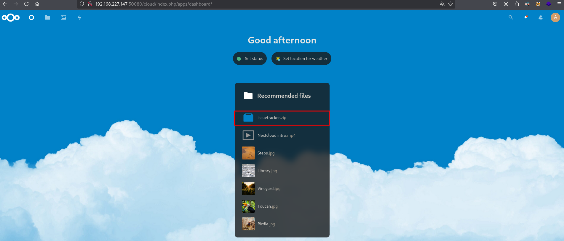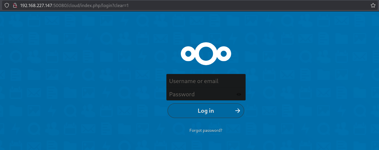 The directories /images and /4 give a directory listing, but nothing interesting, /~ftp is forbidden, and /cloud (http://192.168.227.147:50080/cloud/index.php/login?clear=1) gives us a Nextcloud login screen.