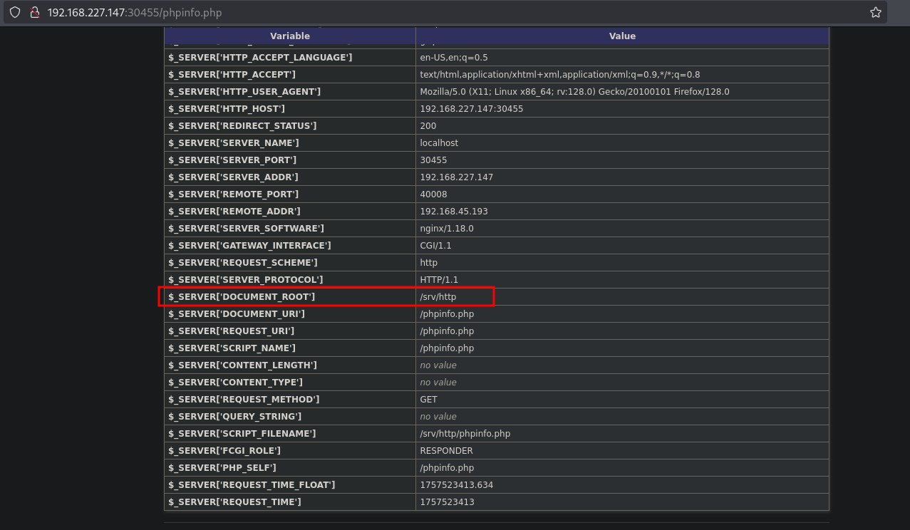 There is a phpinfo.php file in which we find the DOCUMENT_ROOT of /srv/http.