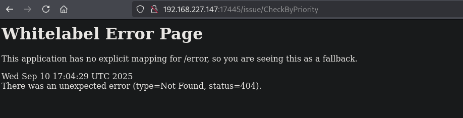 As discussed this endpoint: /issue/checkByPriority is probably vulnerable for SQL injection. So, start BURP and set it on intercept. Now let’s visit this URL: (http://192.168.227.147:17445/issue/CheckByPriority) and send the request in BURP to repeater.