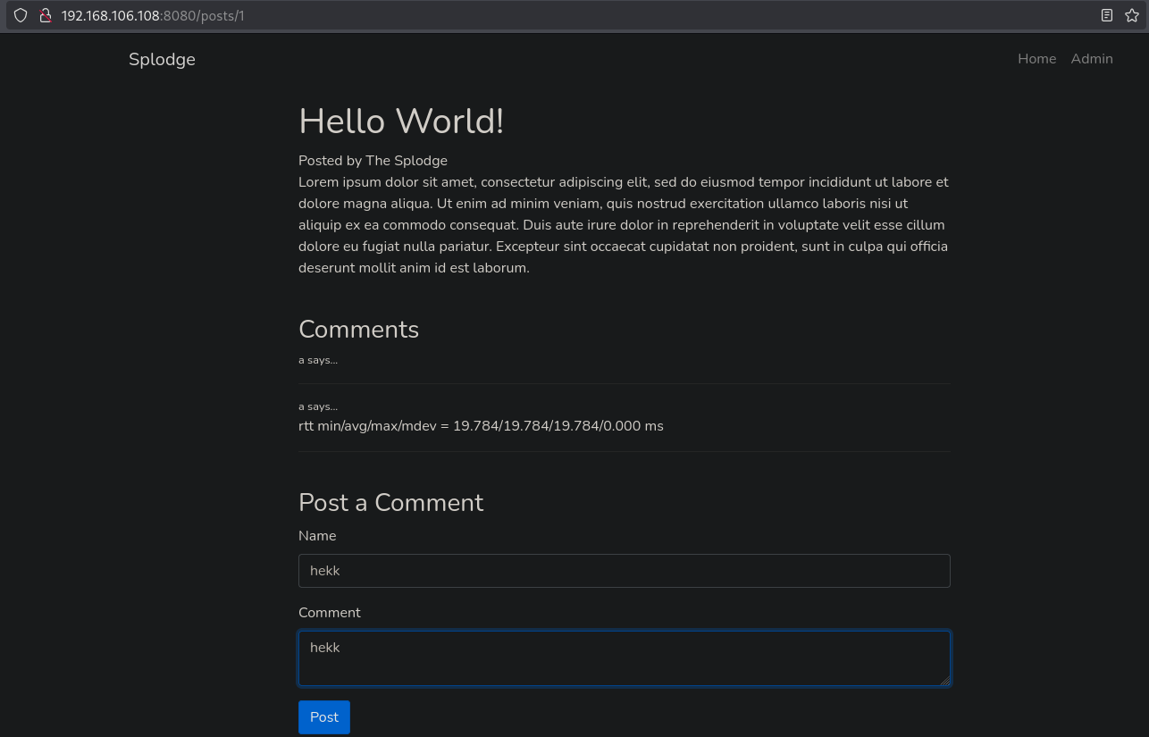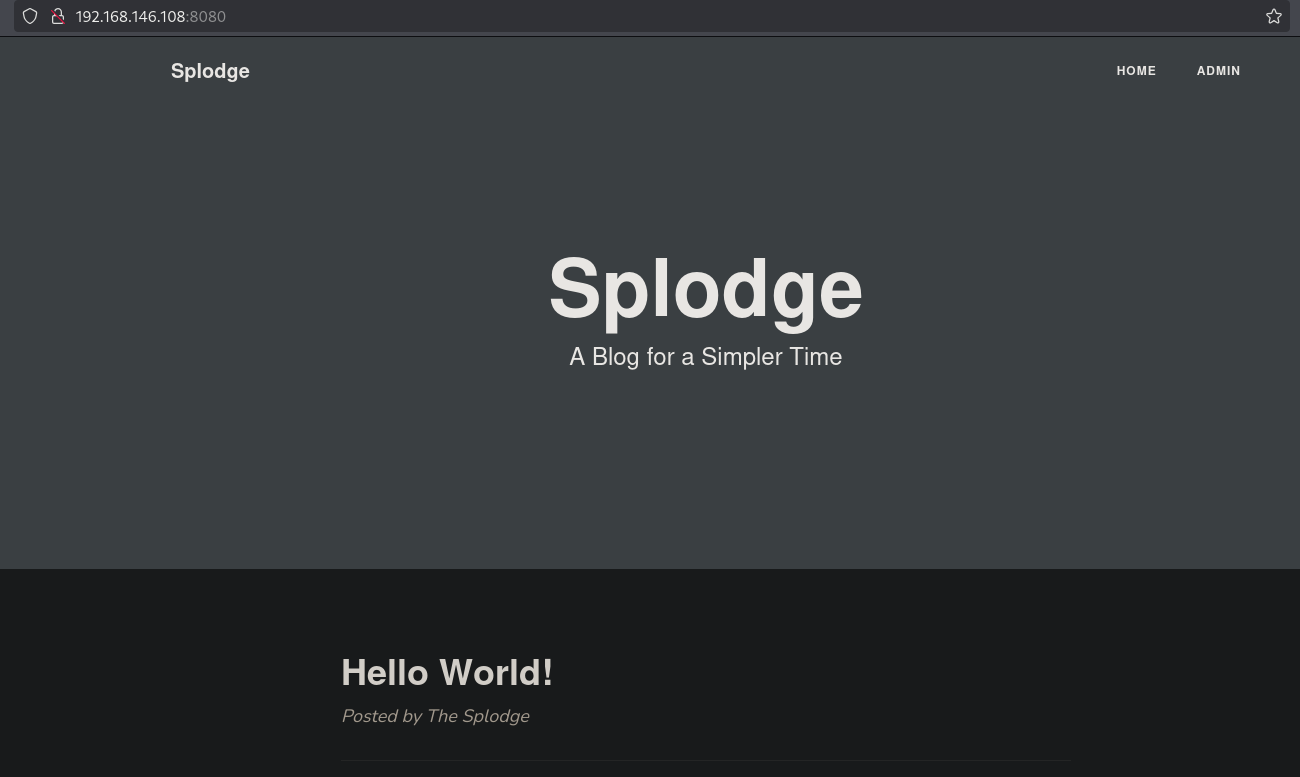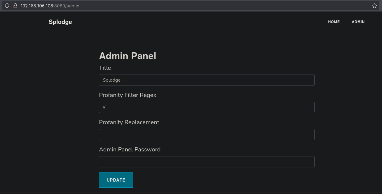 On this page there is a ADMIN link. Clicking on this button we get a login form. Trying the found password with a default user like admin gives us access to the admin panel. Used credentials: admin:SplodgeSplodgeSplodge.