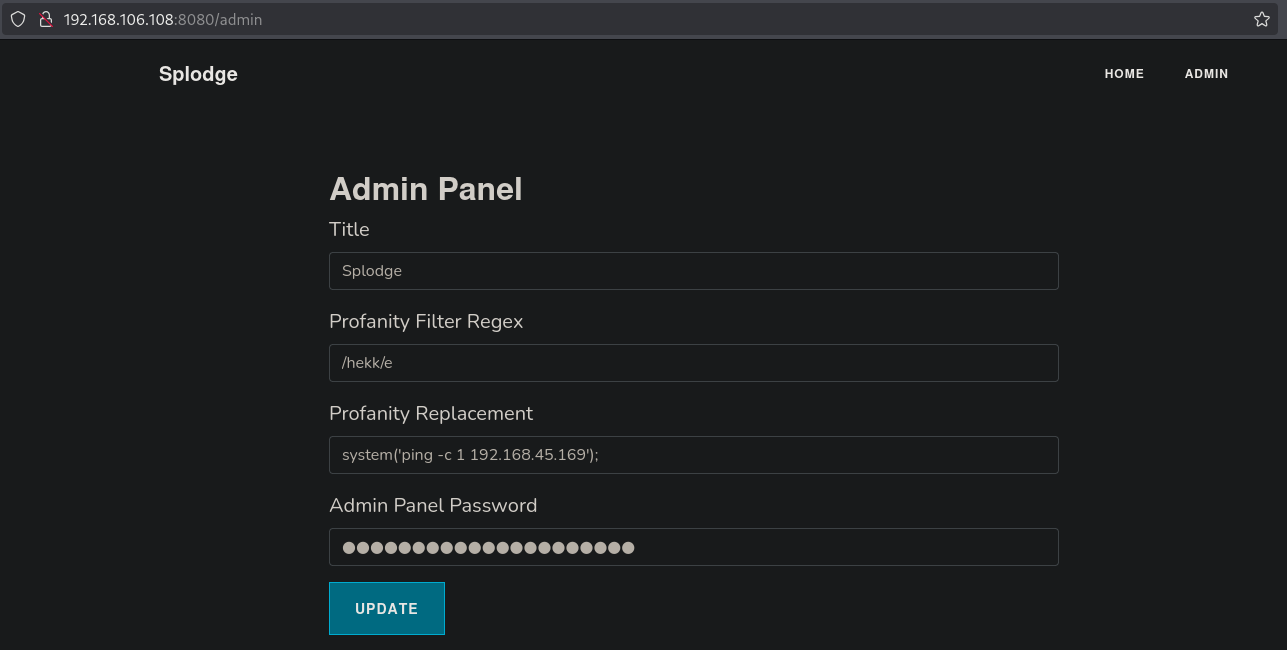 In PHP the /e in preg_replace() is a pattern delimiter flag that causes the replacement string to be dynamically evaluated and executed as PHP code for each matched substring in the input. So we can search for the string hekkand give a replacement command ( system('ping -c 1 192.168.45.169');) to be executed. The Admin Panel Password is our found password SplodgeSplodgeSplodge. Click on UPDATE to update the profanity filter.