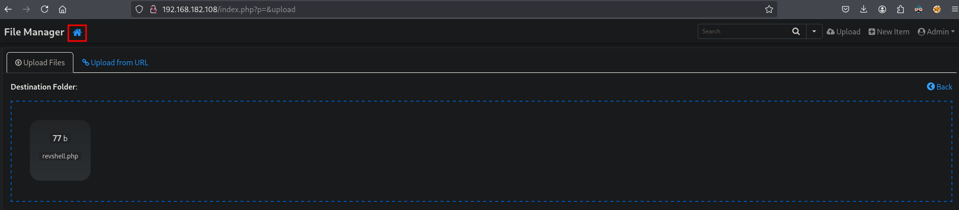 Now upload click on Upload, drag&drop the revshell.php file in the browser and return to home by clicking on the Home button.