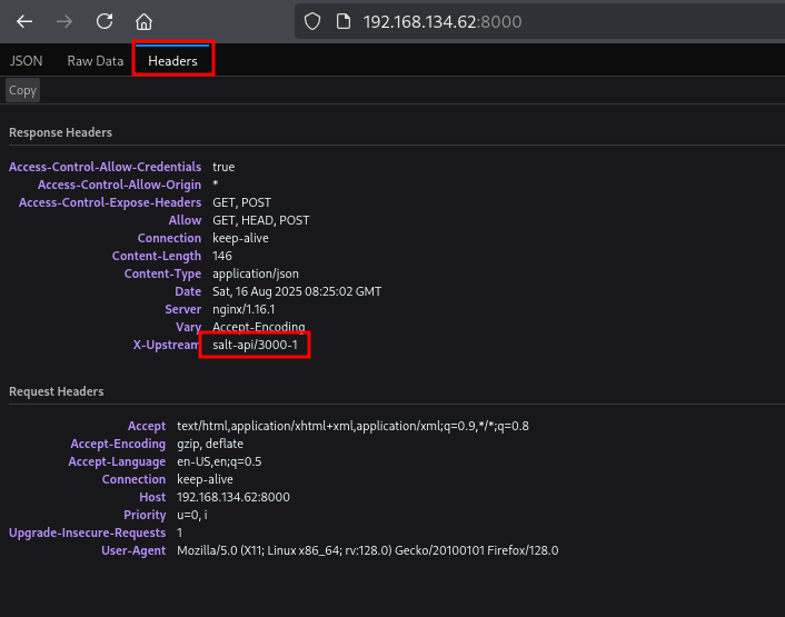 On port 8000 we see there is a response, click on the Headers tab and we see there is a X-Upstream header called salt-api/3000-1.