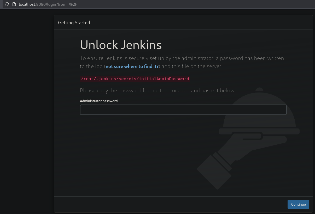 Now that the port forward is ready, go to the browser/URL: http://localhost:8080. There is a page asking for the administrator password to unlock Jenkins . However, we don’t have this. The page does give the location of this password, namely: /root/.jenkins/secrets/initialAdminPassword.
